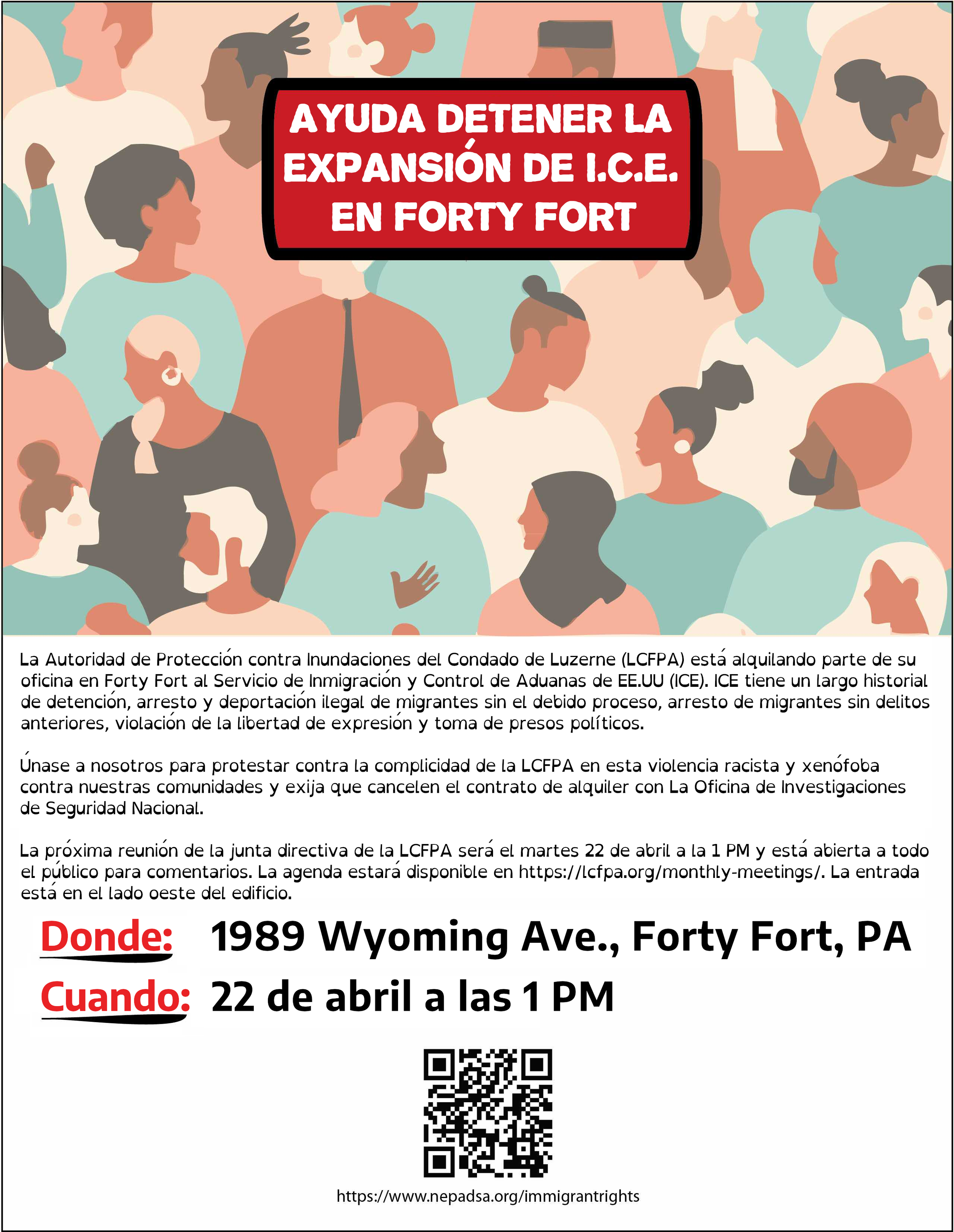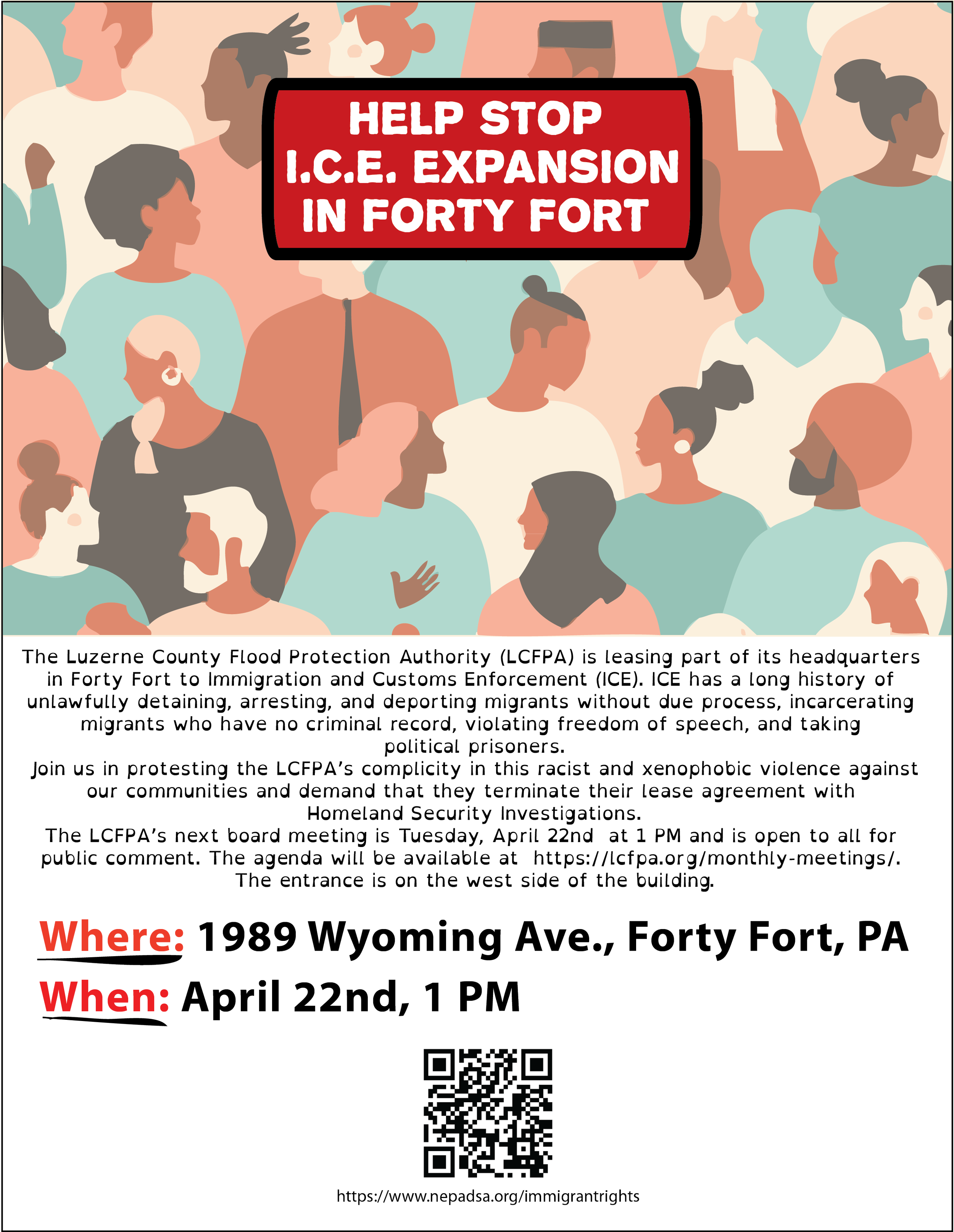 Join us as we work to resist the growing presence of ICE in NEPA, their commandeering of our local law enforcement and justice system, and their violent repression of our friends, family, coworkers, and neighbors. Let us build a future in which no one is illegal.